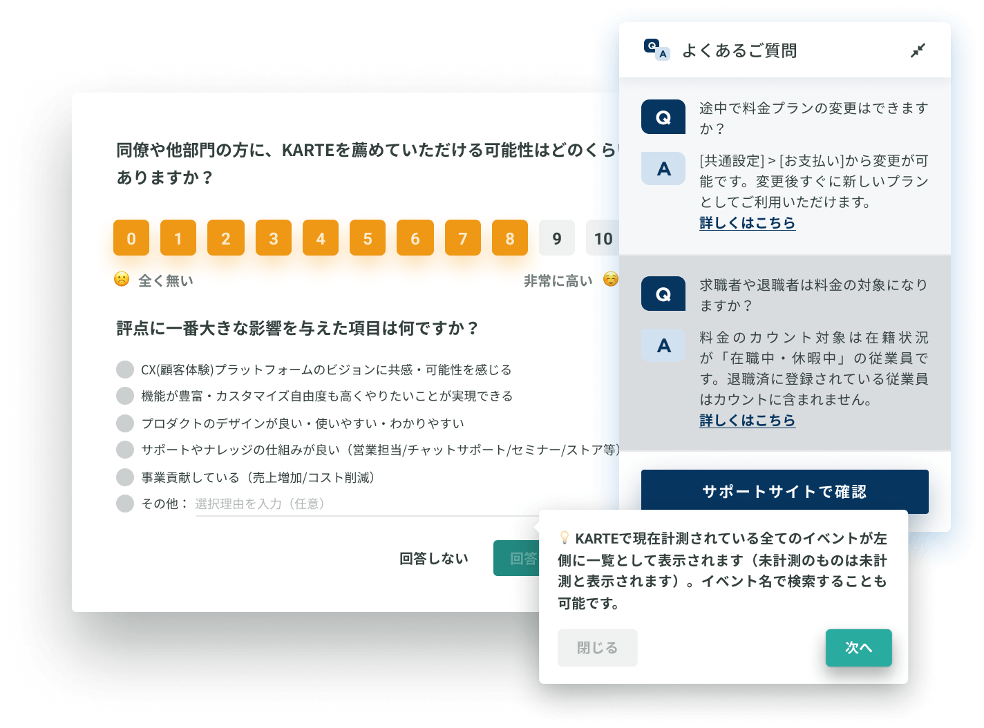サービス利用直後、または継続利用3ヶ月、半年、1年といった節目でNPSなどのアンケートを行うのは効果的です。回答結果をもとに顧客満足度を正確に把握し、サービス改善へつなげていきましょう。KARTEのアンケート機能は、回答を集計するだけでなく、施策の分岐にも活用することができます。