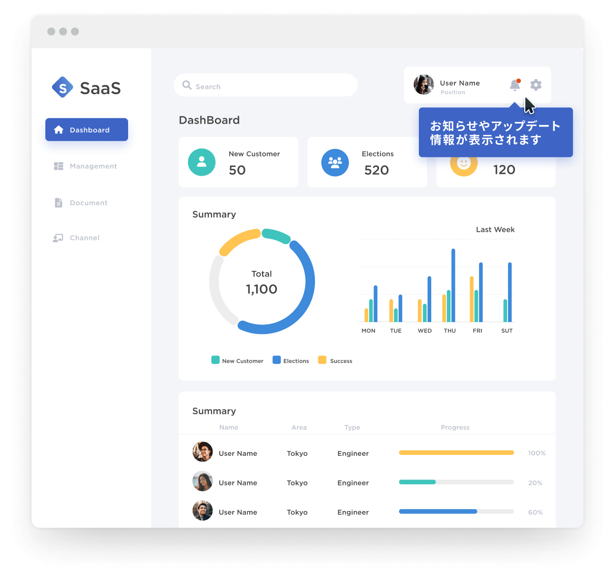 ユーザーにサービスの補助的な情報を最適なタイミングで伝えましょう。属性情報や行動データと掛け合わせることで、初回利用者や特定のセグメントに絞って出すことが可能です。