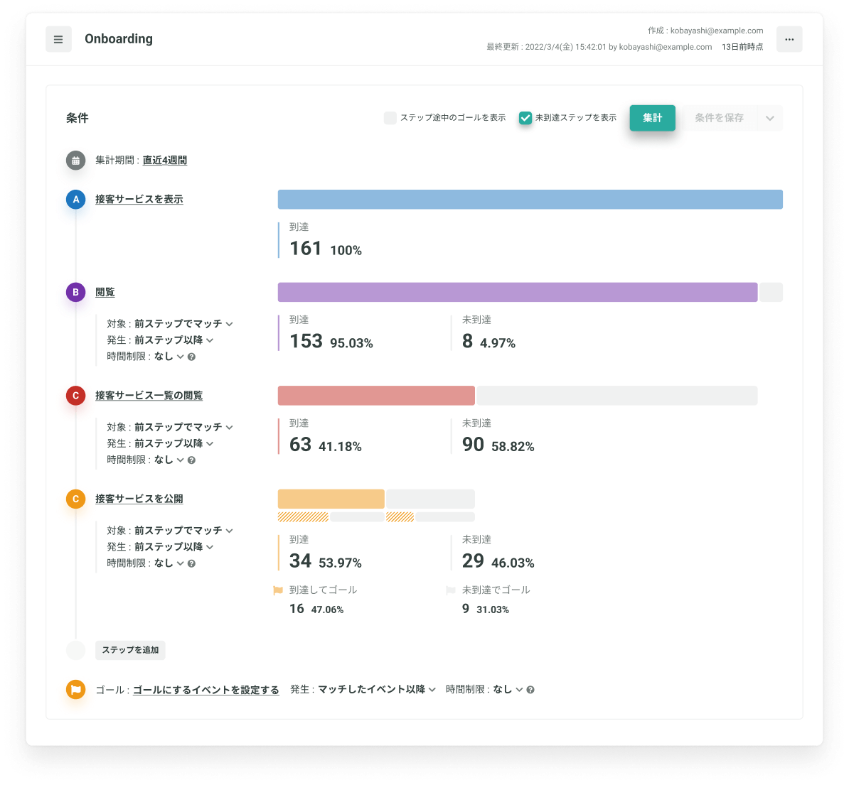 ユーザーの行動ログだけでなく、一連の流れをファネルとして可視化します。ファネルから離脱したユーザーも特定することが可能となり、オンボーディングにおけるユーザーの行動を見ることで改善点を明らかにします。