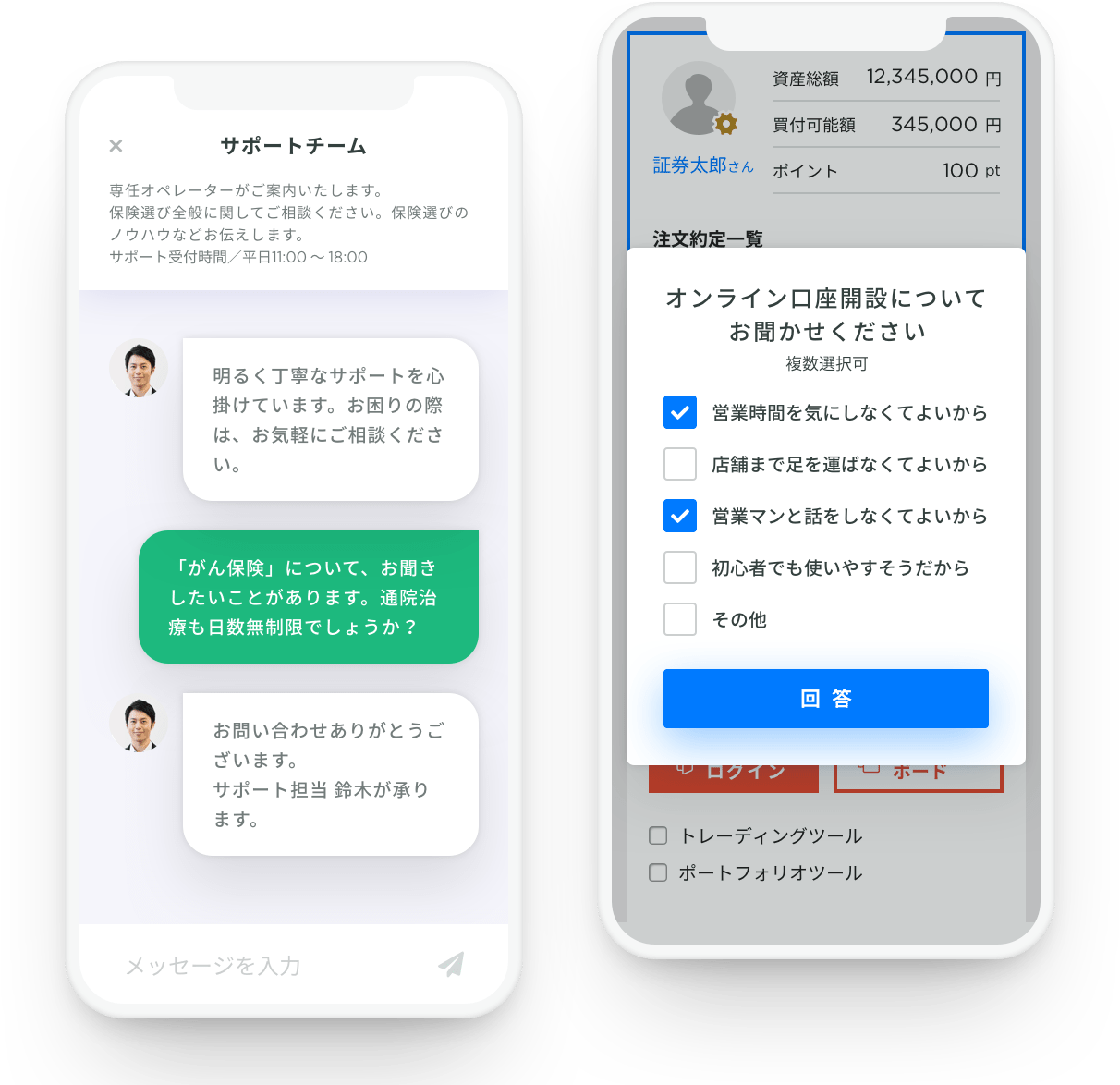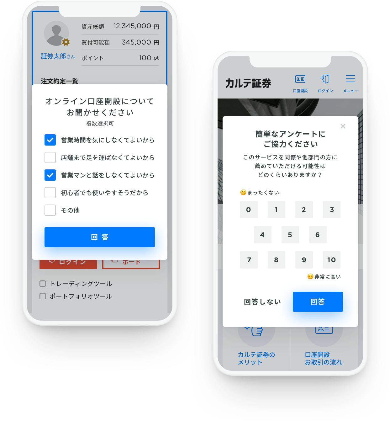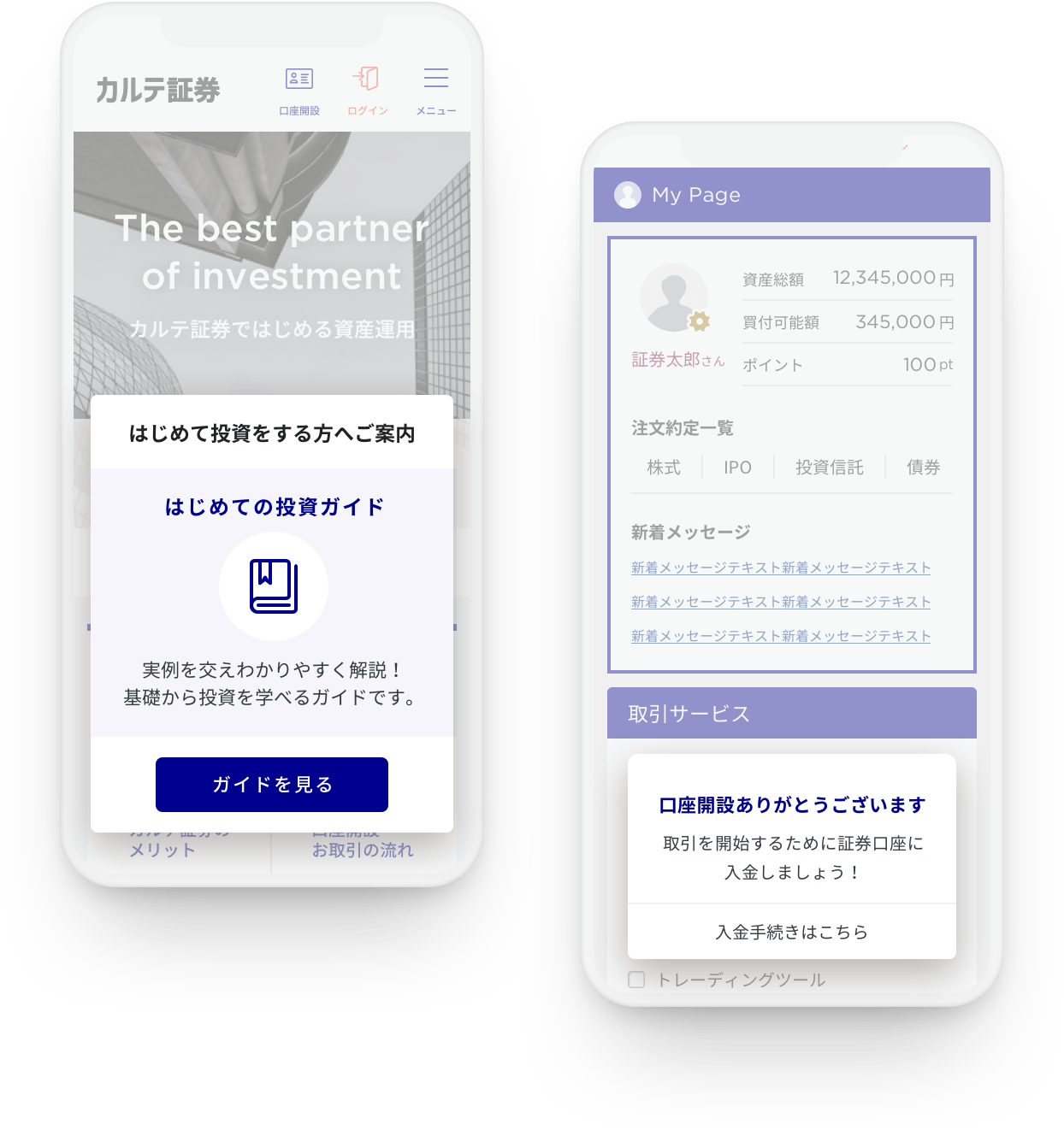 「口座開設後に次のステップである入金手続きが分からない」、「入金完了後にどの銘柄を購入すればよいか迷いなかなか購入に踏みきれない」といった挫折ポイントに到達したユーザーに対して、次のアクションを促すようなポップアップを表示します。