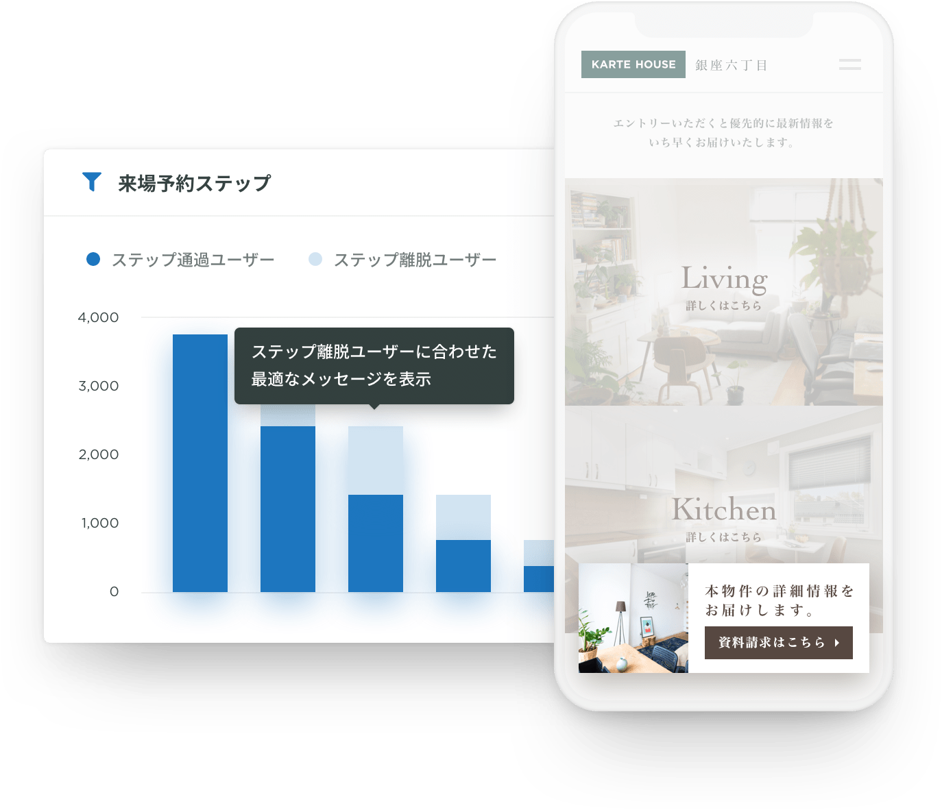 ユーザーダッシュボードの機能を活用し、顧客の離脱ポイントを的確に把握。離脱ポイントに合わせた最適なメッセージを表示して資料請求数アップに繋げます。